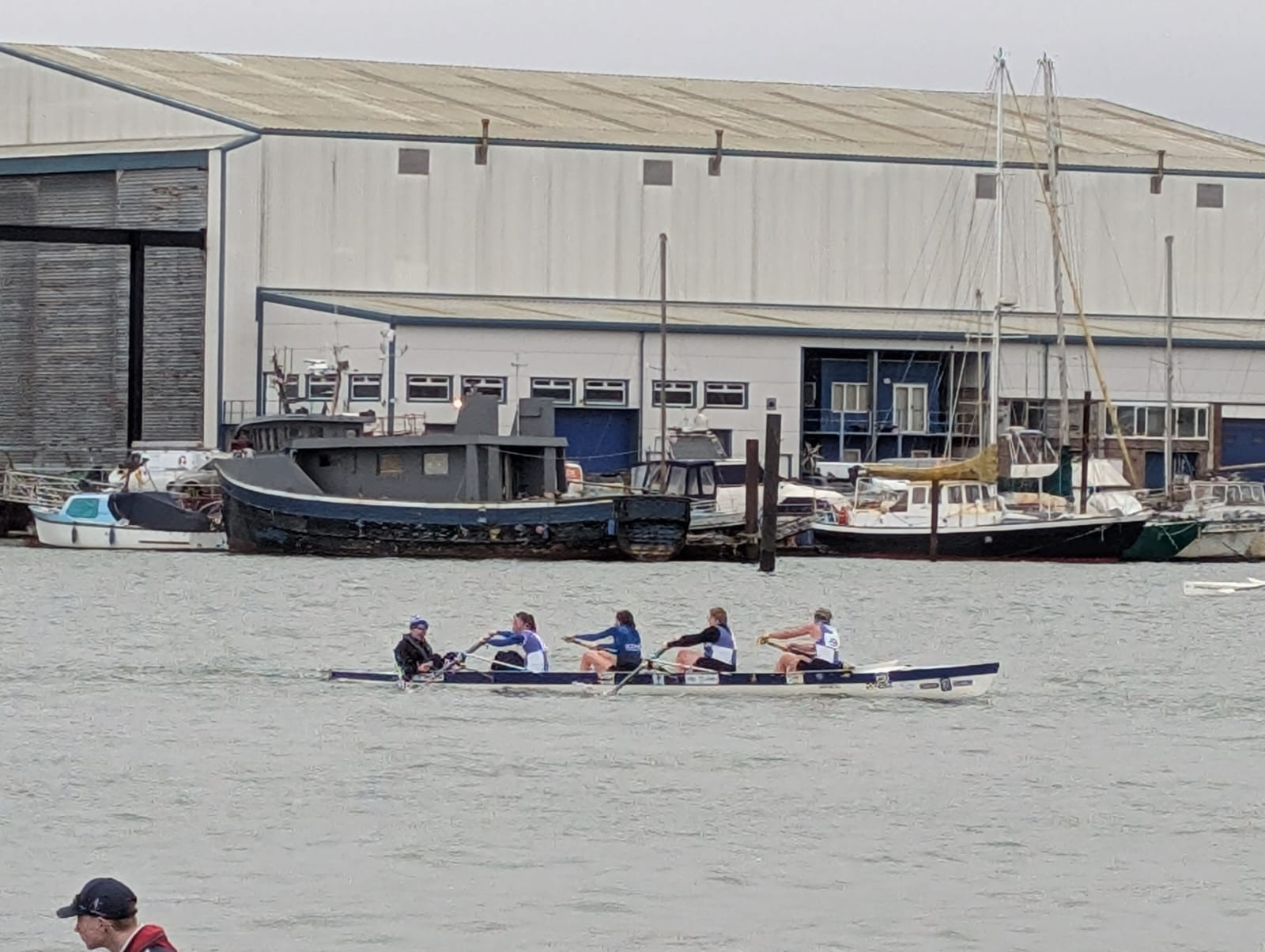 The Woman’s Junior Coastal Four saw two crews competing. Ella Cook, Nikki Leggatt, Holly Hannington, Emily Harvey coxed by Stampton, Dover’s 2025 Championship qualifying crew, racing against last year’s Novice Crew Janice Bradford, Lily Stafford-Edwards, Alex Henchy, Rhiannon Castree coxed by Stothart. Stampton’s crew were chasing Christchurch directly ahead whilst the Stothart crew were chasing Stampton’s. Given the larger field size it was difficult to judge placings as they pushed down the course. Stampton’s crew maintained their time gap with Christchurch whilst they eased away from the Stothart crew. The race was won by Coalporters with Christchurch trailing them by 6 seconds and Stampton’s crew a further 6 seconds back in 21 minutes and 19 seconds. Stampton’s crew also beat the Herne Bay crew by nearly a minute. Stothart’s crew finished in 9th place in the timings, seconds behind the 8th placed Southsea crew.